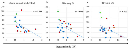 Moderate and weak linear correlations between the intestinal ratio (IR) and stoma output (r = −0.508) (a), parenteral nutrition (PN) based on calories (r = −0.409) (b), and PN based on volume (r = −0.400) (c). Red circle: end-stoma; green circle: tube-stoma; blue circle: Bishop–Koop (BK)-type stoma; orange circle: Santulli-type stoma.