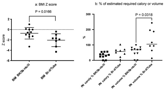 To investigate the clinical effect of stoma revision, either of the Santulli- or the BK-type, we compared the background characteristics (current age, age at intervention, sex, and the IR) and outcomes of stoma revision according to the stoma output, PN dependency, and growth parameters between the group that underwent revision (either Santulli- or BK-type) and the group with an end-stoma or tube-stoma only (Table 3). Although no statistical differences were observed in the IR or the average stoma output between the two groups, the patients in the revision group showed a higher BMI as assessed using Z-scores at follow-up (p = 0.0192) than those in the group with an end-stoma or tube-stoma only (Figure 4a). In addition, a tendency toward a slight PN dependency (p = 0.0318) in volume (Figure 4b) was observed in the group that underwent revision than in the group with an end-stoma or tube-stoma only. These findings indicate that stoma revision involving distal colon rehabilitation may independently affect the PN volume dependency and physical growth, as assessed using the BMI. Indeed, two patients with a BK-type stoma revision were PN-free and remained PN-free for 3 and 8 years after the revision, respectively. Collectively, these findings suggest that the IR and type of revision are both important determinants of the stoma output, PN dependency according to volume, and physical growth in patients with CIHG.