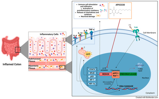 APE1/Ref-1 role in inflammatory bowel disease and the potential of redox signaling inhibition. The activation of transcription factors through the redox function of APE1 is implicated in the promotion of inflammation in inflammatory bowel disease. Furthermore, the subsequent activation of downstream mediators directly affects the inflammatory responses. By inhibiting the redox signaling pathway using APX compounds, the excessive production of pro-inflammatory cytokines, chemokines, reactive oxygen species (ROS), and neuronal damage can be reduced, leading to the alleviation of inflammation and gastrointestinal functions. Additionally, the repair function of APE1 plays a crucial role in mending the DNA or RNA lesions caused by inflammation and oxidative stress. In summary, the utilization of APX compounds can effectively diminish inflammatory markers, ROS levels, and enteric neuropathy, while also enhancing the DNA repair function, thereby presenting a novel therapeutic opportunity for IBD (created with BioRender.com (accessed on 30 September 2023)). Abbreviations: TFs: transcription factors; IL: interleukin; TNF-α: tumor necrosis factor-alpha; ROS: reactive oxygen species; STAT3: signal transducer and activator of transcription 3; NFκB: nuclear factor kappa-light chain enhancer of activated B cells; AP-1: activator protein 1; HIF1α: hypoxia-inducible factor 1 subunit alpha; redox: reduction-oxidation; LPS: lipopolysaccharide; TLR4: toll-like receptor 4; DNA: deoxyribonucleic acid.