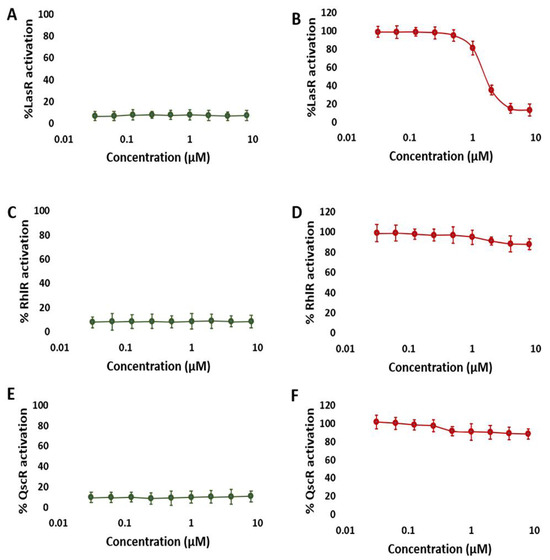 2.5. LasR, RhlR, and QscR Reporter In Vitro Assays