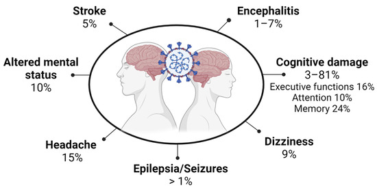 - Cognitive damage: COVID-19 can cause a cognitive deficit, mainly in attention and executive function, and verbal learning; and the incidence is associated with the severity of COVID-19 [68,69]. The prevalence of cognitive impairment due to COVID-19 infection is not well determined. Reported studies have been limited by sample sizes or suboptimal measures of cognitive functioning [70]. Some of the post-COVID cognitive symptoms may be associated with other systemic symptoms [37]. However, systematic reviews analyzing COVID-19 patients show that cognitive impairment ranges from 2.6% to 81% before or at 12 weeks of infection. After 12 weeks, cognitive decline ranged from 21% to 65% [34,71]. Another meta-analysis study that included 27 studies with 2049 individuals found impairment in executive functions (16%), attention (10%), and memory (24%) in post-COVID-19 patients [70,72]. Consistent results have been reported, even in recovered COVID-19 patients, showing lower overall cognition compared to healthy controls up to 7 months post-infection [72].