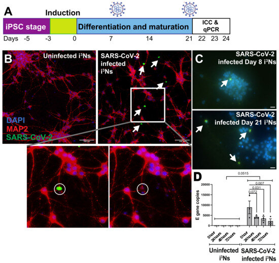 SARS-CoV-2 isolate hCoV-19/New Zealand/NZ1_patient/2020 was produced in Vero E6/TMPRSS2 cells as described [52]. The viral stock was titrated by determining tissue culture dose for 50% infectivity (TCID50) in triplicate with cytopathic effect (CPE) as the end-point using the Reed and Muench method [53] and expressed as TCID50 per millilitre (TCID50/mL). The SARS-CoV-2 titre was used to determine the appropriate MOI to be added to the iPSC-derived i3Ns (Section 2.1) or iAs (Section 2.2). Younger (Day 8) and mature (Day 21) i3Ns were exposed to SARS-CoV-2 using two different MOIs, i.e., 2 and 10, for 24 h, followed by fixing the cells with 4% paraformaldehyde and immunocytochemistry (Figure 1B,C). Similarly, Day 17 iAs were exposed to SARS-CoV-2 at 10 MOI, followed by 24 h infection and immunocytochemistry (Figure S2A).
