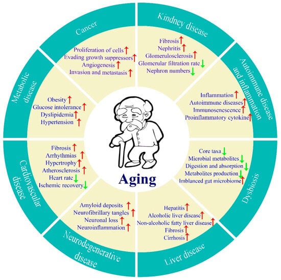 We humans all age without exception. Aging is a natural and inescapable phenomenon characterized by a progressive deterioration of physiological functions, leading to increased vulnerability to chronic diseases and death. With economic and medical development, the lifespan of human beings continues to grow throughout the world. It is estimated that there will be more than 795 million people aged 65 years old or over globally by 2023 [1], and this figure will reach 994 million by 2030 and 1.6 billion by 2050, respectively [2]. Aging is usually accompanied by many age-related diseases such as cancer, cardiovascular disease, metabolic disease, kidney disease, liver disease, neurodegenerative disease, autoimmune disease and inflammation, and dysbiosis (Figure 1), as well as other chronic diseases, creating pressure on social health insurances and causing a large economic burden in most countries. Thus, healthy aging has now become a common aspiration among people all over the world.