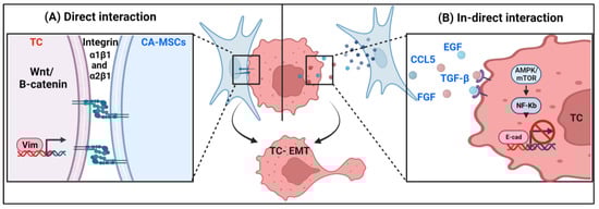 Activation of EMT-inducing pathways via cell–cell interaction. CAMSCs can activate the EMT-inducing pathway through: (A) direct CAMSC–tumor cell interaction; (B) indirect CA-MSC and tumor cell interaction via the secretion of growth factors (created with BioRender.com).
