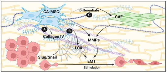Activation of EMT-inducing pathways via extra cellular matrix (ECM) remodeling. CA-MSCs can stimulate EMT through: (A) collagen IV deposition; (B) increasing lysyl oxidase (LOX); (C) differentiating into cancer-associated fibroblasts (CAFs) (created with BioRender.com).