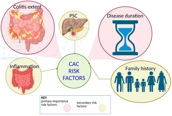 Colitis-associated colitis risk factors. Previous studies have suggested that the risk of CAC increases with longer duration of disease, the extent of colitis, a familial history of CRC, coexistent primary sclerosing cholangitis (PSC), and the degree of inflammation. Disease duration and colitis extent rank as the two most important risk factors in identifying IBD-associated CRC.