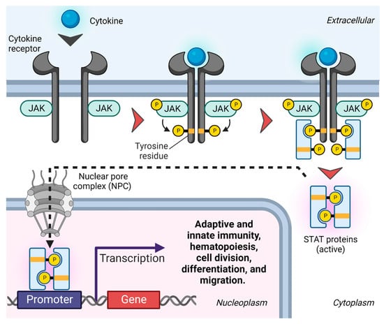 The JAK-STAT signaling pathway orchestrates cell signaling through intracytoplasmic protein-tyrosine kinases that bind the cytoplasmic region of transmembrane cytokine receptor subunits upon cytokine activation. The JAK-STAT signaling pathway consists of type I and type II cytokine receptors, four JAK family members (JAK1, JAK2, JAK3, and tyrosine kinase 2 (TYK2)), along with seven STAT family members (STAT1–4, STAT5a/b, and STAT6). Type II receptors (interferons (IFNs) (type 1, -2 or -3) and IL-10 receptor families) are distinguished from type I receptors (gp130, IL-12, and common γ- and β-chain receptor families) by the lack of a WSXWS motif—a molecular switch involved in receptor activation []. The STAT-JAK signaling pathway regulates numerous important cellular functions, including adaptive and innate immunity, hematopoiesis, cell division, differentiation, and migration [] (Figure 3).