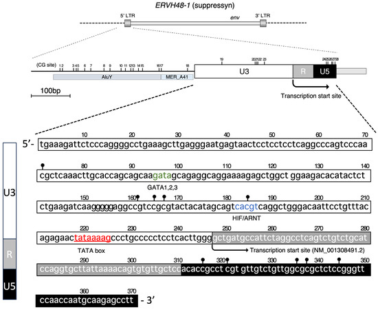 To better define the promoter sequence of suppressyn, we focused on the 5′ LTR of ERVH48-1, a transcriptional regulatory sequence that is characteristic of endogenous retroviruses, and verified its activity as a promoter. The total length of the 5′ LTR of suppressyn is 360 bp, which comprises a U3 segment of 246 bp, an R segment of 65 bp, and a U5 segment of 59 bp (Figure 1); the transcript (Transcript (+1) of the NM_001308491.2) begins in the R region downstream from a TATA box located at the U3 region (+30 bp). The 3′ flanking sequence is tandemly flanked by upstream MERA41 and AluY sequences. Twenty-eight CpG sites are present in this region and are expected to be targets for DNA methylation (Figure 1).