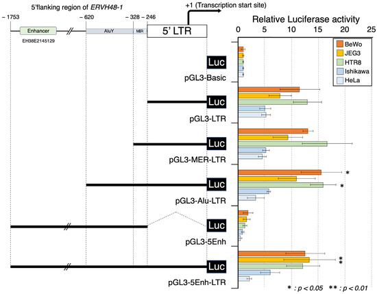 We amplified the 5′ LTR region using primers with restriction enzyme (KpnI/XhoI) linkers (Supplementary Table S1) and cloned this product into the KpnI/XhoI site of the pGL3-basic vector. Promega’s dual-luciferase assay was performed using these constructs and confirmed minimal promoter activity in all cell lines (BeWo, JEG3, HTR8, Ishikawa, and HeLa) transfected with this modified vector. Over 20-fold lower activity was noted when compared to similar experiments in the same cells using the promoter sequence of endogenous retrovirus-derived syncytin-1 (Supplementary Figure S1). This suggested the presence of an enhancer sequence in the vicinity of the MER-A41, AluY sequences, and/or the 5′ flanking sequence (EH38E2145129), which was further predicted by the ENCODE registry of candidate cis-regulatory elements (cCREs) analysis of the sequence upstream of the 5′ LTR (Figure 2). Each of the modified sequences was cloned via PCR amplification (Supplementary Table S1) and introduced into BeWo, JEG3, HTR8, Ishikawa, and HeLa cells to allow for the assessment of the enhancer effects of each of these sequences. The 5′ flanking sequence (pGL3-5Enh) alone did not display promoter activity, indicating that the remainder of our sequences were expected to function as enhancers. A weak enhancer effect (p < 0.05) was observed for the sequence containing the AluY sequence (pGL3-Alu-LTR), but no statistically significant enhancement of expression was observed for the candidate enhancer sequence (pGL3-5Enh-LTR) or MERA41 (pGL3-MER-LTR) (Figure 2). Further, the GCM1 binding sequence that functions as a major site for tissue-specific transcriptional control for ERVW-1 is not found in the ERVH48-1 LTR and 5′ flanking sequences. Thus, unlike syncytin-1, the placental expression of suppressyn is not dependent on GCM1, which is only expressed in trophoblast cells [32,33,34] (Supplementary Figure S2).