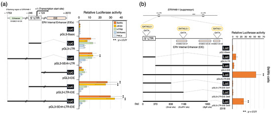 Luciferase activities of the ERVH48-1 promoter and novel enhancer sequences (EIEs). (a) The schematic diagram on the left depicts the suppressyn 5′ LTR and its flanking sequences, including the 5′ flanking region of ERVH48-1 and putative enhancer sequences (ERV Internal Enhancers; EIEs). Below, the separate constructs cloned into the pGL3 vector and the regions they cover, including the 5Enh, LTR, and EIE sequences, are shown. On the right, relative luciferase activity was plotted for these constructs for each cell line used (BeWo, JEG3, HTR8, Ishikawa, and HeLa cells). (b) The left side of this diagram depicts a schematic of the ERVH48-1 5′ LTR and EIE sequences. Details of the whole and the restriction enzyme-truncated (SmaI, EcoRV, and BglII) pGL3 constructs are shown below this. Three enhancer regions in the EIEs were predicted via cCRE. Predicted binding sites for GATA transcription factors in this region are presented (…GATA…). Luciferase activity associated with the transfection of these constructs into BeWo cells is shown on the right. Luciferase activity associated with the presence of the pGL3-basic construct was used as a comparator for statistical analysis. Mann–Whitney U tests were performed, and statistical significance was set at ** p < 0.01. Experimental replicates were performed in duplicate, and the means ± SDs were calculated from three independent experiments.