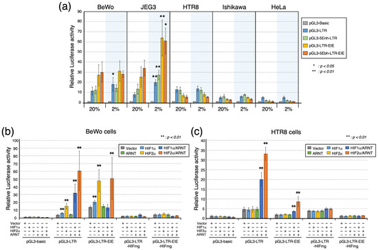 ERVH48-1 promoter activity in low and high oxygen conditions. (a) Comparison of ERVH48-1 promoter activity under low and high oxygen conditions (2% or 20%). Luciferase activity of ERVH48-1 promoter sequences in BeWo, JEG3, HTR8, Ishikawa, and HeLa cells when cultured at 20% O2 (left column) or 2% O2 (right column). (Bars from left to right: pGL3-basic, -LTR, -5Enh-LTR, -LTR-EIE, and -5Enh-LTR-EIE.) Luciferase activities for each construct were normalized to pGL3-basic and compared to values for each reporter construct cultured under 20% O2 results to assess statistical differences. (Mann–Whitney U test: * p < 0.05; ** p < 0.01.) Experiments were performed in duplicate, and the means ± SDs were calculated from three independent experiments. (b) The effects of transient expression of hypoxia-inducible proteins (HIF1α, HIF2α, and ARNT) on the transcriptional activity of each ERVH48-1 promoter construct in BeWo cells and (c) in HTR8 cells. pGL3-basic was included as a reference. Statistical analysis was performed, comparing the luciferase activities in cells exposed to the vector-only transfected control with those in which each gene or genes were transiently transfected (Mann–Whitney U test: ** p < 0.01). Experiments were performed in duplicate, and the means ± SDs were calculated from three independent experiments.