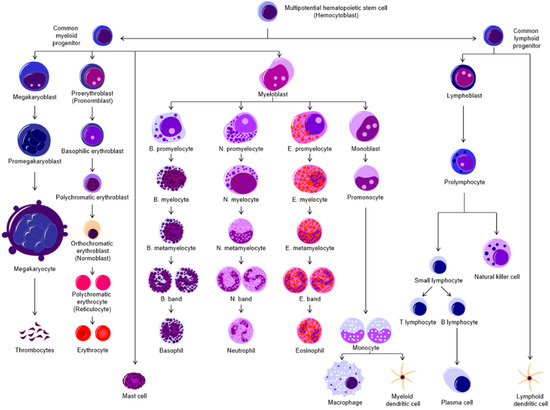 Hematopoiesis is the process by which all the blood cell types are produced through differentiation from increasingly lineage-committed precursor cells in the adult BM. Broadly, the cells can be classified as myeloid or lymphoid in origin. The myeloid lineage gives rise to thrombocytes (platelets), erythrocytes, granulocytes (mast cells, basophils, neutrophils, eosinophils), macrophages, and myeloid-derived dendritic cells (DCs). The lymphoid lineage produces T- and B-lymphocytes, natural killer (NK) cells, and lymphoid DCs.