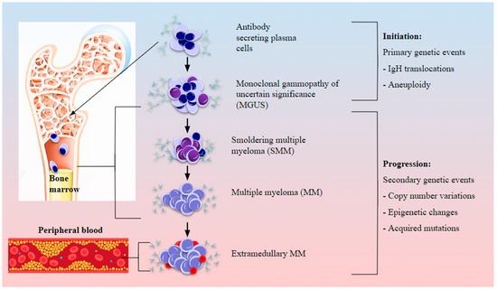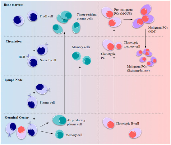 Immature plasma cells (PCs) originate from the lymphoid progenitor lineage [1,2], express a surface B-cell immunoglobulin receptor (BCR), and move to secondary lymphoid organs [3,4]. Here, the B-cells start to mature while remaining non-proliferative and transcriptionally dormant but primed for antigen recognition through the toll-like receptors (TLR) or the BCR [3,5]. B-cell activation can then occur in a T-cell-independent or dependent manner to generate acute or long-term immunity. The latter process involves complex activation by cytokines and affinity maturation in the germinal center of the lymph nodes. During activation and differentiation, B-cells are equipped to express a host of antibodies through the physiological process of class-switch recombination and somatic hypermutation [3,5,6]. However, these processes are highly error-prone and can cause the accumulation of genomic changes such as chromosomal translocations and aneuploidies [3,5]. Such translocations can place proto-oncogenes under the control of powerful enhancers in the Ig gene locus which can create aberrant PCs that can establish multiple myeloma (MM) precursor conditions such as monoclonal gammopathy of uncertain significance (MGUS) and smoldering MM (SMM) [5,7,8,9].