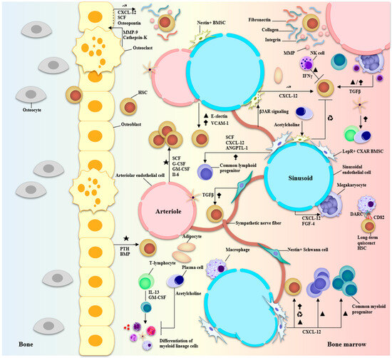 Supporting cells are also involved in the direct or indirect regulation of hematopoiesis. Neurons of the sympathetic nervous system (SNS) influence osteoblast activity and the osteocyte network and mediate hematopoietic progenitor cell mobility through G-CSF [168]. Further, sympathetic nerve fibers use β3 adrenergic receptor signaling to regulate CXCL-12 expression in Nes+ mesenchymal and stromal progenitor cells, which is required for HSC mobilization from the BM [81,169]. Adrenergic signaling mediated by the interaction of CCR7 and CXCR-4 with the β2 adrenergic receptor and concerted chemokine expression is also important for leukocyte release from the lymph nodes as well as their homing to the BM through endothelial adhesion molecule signaling [169,170,171].