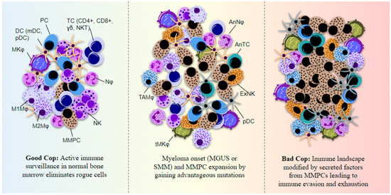 Disruptions to genome integrity, transcription efficiency, and cell-specific protein expression capacity affect several cellular processes including hematopoiesis [48]. Such events can drive the malignant transformation of BM cells and alter the environment in a manner disruptive to normal cells but favorable for their own survival and proliferation [49]. A double-edged hypothesis is suggested by several studies whereby both the microenvironment and the hematopoietic cells themselves are suggested to initiate or promote malignancy [42,50,51,52]. Cells of the hematological lineage and the BMME can co-evolve to promote tumorigenesis, cancer progression, and the development of drug resistance. In MM, the BMME exhibits distinct, stage-specific profiles (Figure 5).