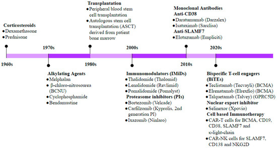 Timeline of therapeutic developments in MM. Historically, corticosteroids were the first drugs to be used in MM treatment, and in the late 1970s, BM stem cell transplantation became one of the most promising treatments in eligible patients. Discovery of the proteasome inhibitor (PI) bortezomib was a significant advancement in MM treatment and remains the standard first-line therapy in most MM regimens today. The last decade has witnessed significant research into targeting the dysregulated immune landscape as well as myeloma cell-specific markers through development of antibody- and cell-based immunotherapeutic approaches.