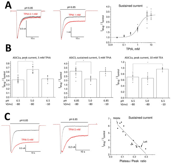 The effect of an allosteric modulator is controlled by affinity and efficacy. This is why it is important to reveal which parameter is responsible for the lack of activity of small tetraalkylammonium ions. We studied the action of 5 mM TPtA on ASIC1a and ASIC3 in the presence of the inactive TMA at 5 mM. If TMA does not bind (i.e., it has a weak affinity), it should not affect TPtA action. Contrarily, if the absence of action of TMA is due to weak efficacy, it would compete with TPtA, thereby reducing TPtA action. In both cases (ASIC1a and ASIC3), the effect of TPtA was not changed by the presence of 5 mM TMA (n = 5, p < 0.05), suggesting that TMA and presumably other small-size tetraalkylammonium ions have weak affinity.