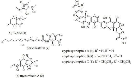 6 even at concentrations in the low µg/mL range. Our observations suggested that enhancing lipophilicity could potentially enhance the dispersal properties of cryptosporioptides. In particular, cryptosporioptides with an increase in length and number of lipophilic side chains might have stronger effects on the eradication of preformed biofilms compared with those lacking such lipophilic side chains. This observation occurs in a concentration range below cytotoxic (IC