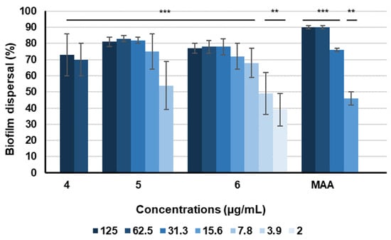 50 > 37 µg/mL) and lethal effects (MIC > 66.6 µg/mL), making it a promising candidate for future therapeutic applications. According to the National Institute of Health, biofilms cause approximately 60–80% of all microbial infections and no specific treatments are presently available [