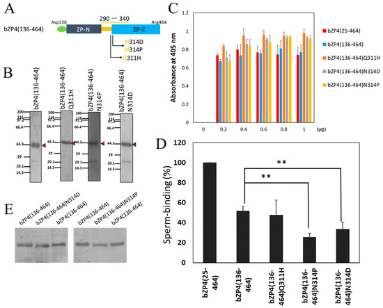 Recombinant bZP3 and bZP4 expressed in Sf9 cells form a heterocomplex that exhibits bovine sperm-binding activity [17]. Moreover, the complex between the N-terminal fragment of bZP3 (32–178) (Figure 1C and Figure 4A) and bZP4 inhibits sperm–ZP binding, as shown using competitive inhibition assays. The inhibitory activity requires N-glycosylation at Asn-146 of bZP3 (32–178) [20]. In this study, we analyzed the involvement of the N-glycosylation site at Asn-314 of bZP4 (136–464) in sperm-binding activity in the context of bZP3 (32–178)/bZP4 (136–464) complex using the solid support assay.