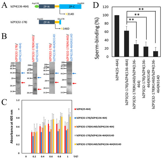 The number of bovine sperm bound to wells coated with bZP3 (32–178) N146D/bZP4 (136–464) was significantly lower compared to that bound to bZP3 (32–178)/bZP4 (136–464)-coated wells (Figure 4D). This was consistent with a previous finding that the mutation of Asn-146 to Asp on bZP3 (32–178) reduces the sperm-binding activity of bZP3 (32–178)/bZP4 (25–464) complex [20]. The sperm-binding activity of bZP3 (32–178)/bZP4 (136–464) N314D was significantly reduced compared to bZP3 (32–178)/bZP4 (136–464). This suggests that mutating Asn-146 to Asp on bZP3 (32–178) possibly has additional effects on the sperm-binding activity of bZP3 (32–178)/bZP4 (136–464) N314D complex (Figure 4D). However, there were no significant differences in sperm-binding activities between any pair among the three complexes, bZP3 (32–178) N146D/bZP4 (136–464), bZP3 (32–178)/bZP4 (136–464) N314D, and bZP3 (32–178) N146D/bZP4 (136–464) N314D. These results suggest that both N-glycosylation sites of bZP3 (32–178) and bZP4 (136–464) are necessary for sperm-binding activity.