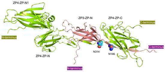 Mammalian oocytes are enveloped by the zona pellucida (ZP), a specialized extracellular coat, which is involved in oogenesis and species-selective sperm recognition. It also participates in blocking polyspermy and protecting the developing embryo [1,2,3]. The ZP of most mammals, including the human ZP, contains four glycoproteins (ZP1–4) [4], whereas mice (m) ZP, porcine (p) ZP, and bovine (b) ZP possess only three (mZP1–3, pZP2–4, and bZP2–4, respectively) [5,6]. All ZP proteins contain a ZP module, necessary for the formation of ZP filaments, which consists of two structurally related immunoglobulin (Ig)-like domains (ZP-N and ZP-C) that are connected by a short, flexible hinge region (see Figure 1A,C) [7,8,9]. Despite the structural similarity in the amino acid sequences, ZP proteins are highly heterogeneous due to their post-translational modifications, including glycosylation of N (asparagine)- and O (serine/threonine)-linked carbohydrates, whose compositions, such as sialylation and sulfation, vary across several mammalian species [3].