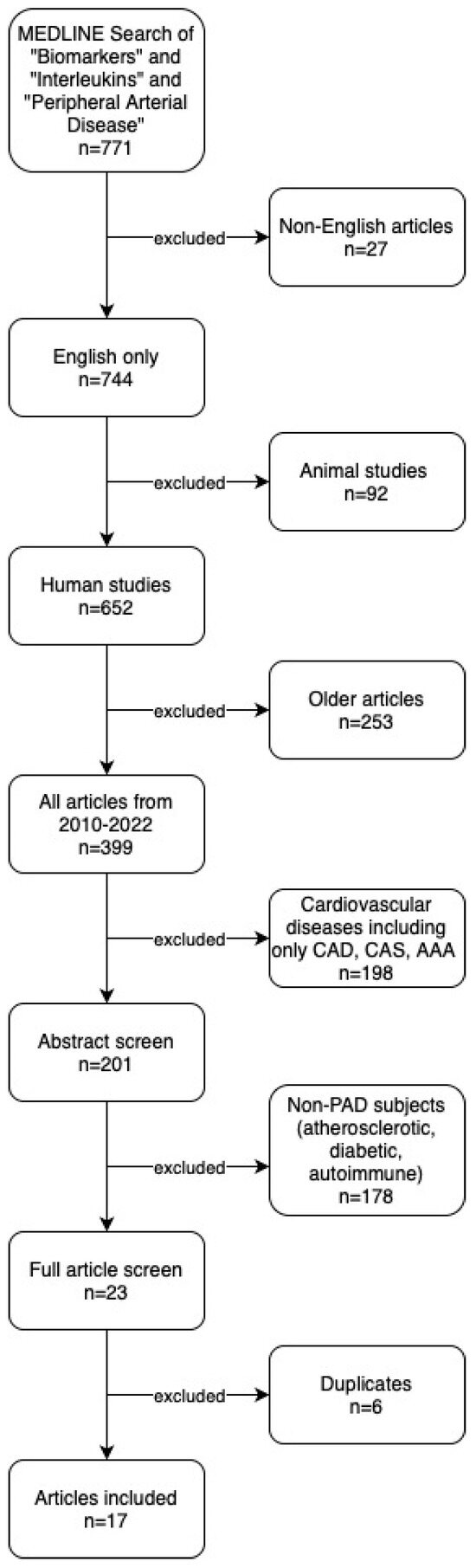 We identified 771 articles through our search of MEDLINE and the following articles were excluded: non-English (n = 27), animal studies (n = 92), articles published before 2010 (n = 253), cardiovascular disease [CAD, CAS, AAA] (n = 198), non-PAD (n = 178), and duplicates (n = 6). Hand-search of reference lists identified no additional articles. In total, 17 studies were included in the final systematic review and qualitative analysis. Our search results are summarized in the PRISMA study flow diagram (Figure 1).