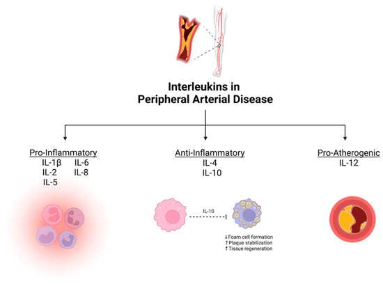 Inflammation plays a major role in the initiation and chronic nature of systemic atherosclerosis which contributes to PAD. ILs are cytokines with diverse functions including both promoting and reducing inflammation, in addition to the initiation and progression of atherosclerosis. Some well-known pro-inflammatory cytokines such as IL-1, TNF-α, and IL-6 exert effects such as promoting endothelial dysfunction, monocyte migration, smooth muscle cell proliferation, thrombus formation, and plaque destabilization. Conversely, anti-inflammatory cytokines such as IL-10 offer protective effects by means of suppressing inflammatory pathways and regulating the immune response.