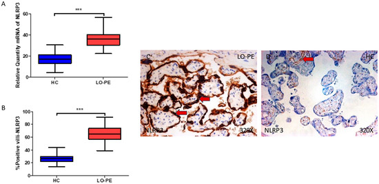 (A) NLRP3 mRNA expression in women with LO-PE and HC. (B) IRS scores for NLRP3 expression in the placental villi of the LO-PE and HC group. (C,D) Images showing immunostaining for NLRP3 in the placental villi of the LO-PE and HC. p < 0.001 (***). Red arrows: Tissue expression of NLRP3 was strongly evidenced in the syncytiotrophoblast layer of women with LO-PE, whereas for HC, it is more limited to the cytotrophoblast and other cells located in the inner of placental villi.