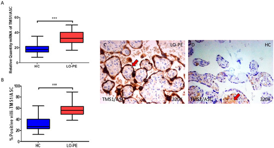 In parallel, we observed a significant increase in ASC gene expression in the placental tissue of pregnant women who have LO-PE (*** p < 0.0001; LO-PE = 32.284 [16.562–49.768], HC = 17.562 [7.317–35.326], Figure 2A). Histological analysis of the placental villi showed that the chorionic villi of women with LO-PE showed a significant increase in the protein expression of ASC (*** p < 0.0001; LO-PE = 56.000 [38.000–89.000], HC = 27.000 [12.500–64.000], Figure 2B). The tissue expression of ASC was strongly evidenced throughout the placental villi of women affected by LO-PE, particularly in the syncytiotrophoblast layer in comparison to HC, in which a moderate expression of this marker is observed in the cytotrophoblast and other cells located in the inner layer of the placental villi (Figure 2C,D).