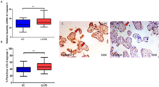 (A) Caspase 1 mRNA expression in women with LO-PE and HC. (B) IRS scores for caspase 1 expression in the placental villi of the LO-PE and HC group. (C,D) Images showing immunostaining for caspase 1 in the placental villi of the LO-PE and HC. p < 0.01 (**). In red arrows, the expression of caspase 1 in the syncytiotrophoblast layer and also in the cytotrophoblast and other cells in the inner layer of the placental villi in women with LO-PE is highlighted, whereas for HC, it is more located in the syncytiotrophoblast layer.