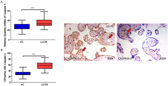 (A) Caspase 5 mRNA expression in women with LO-PE and HC. (B) IRS scores for caspase 5 expression in the placental villi of the LO-PE and HC group. (C,D) Images showing immunostaining for caspase 5 in the placental villi of the LO-PE and HC. p < 0.001 (***). In red arrows, caspase 5 expression is observed throughout the placental villi of women affected by LO-PE in comparison to HC, in which this marker can be slightly observed in the cytotrophoblasts and other cells in the inner layer of the placental villi.