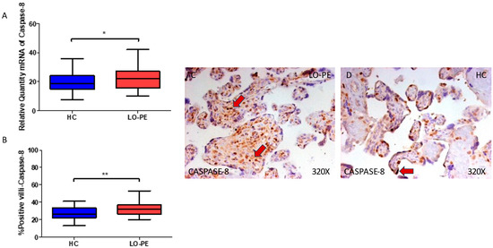 Finally, regarding caspase 8, we observed an enhanced gene expression of this component in the placental tissue of women with LO-PE (* p = 0.0370; LO-PE = 22.019 [10.156–42.006], HC = 18.652 [7.515–35.616], Figure 5A). Histological analysis of the placental villi showed that the chorionic villi of women with LO-PE showed a significant increase in the protein expression of caspase 8 (** p = 0.0014; LO-PE = 32.000 [20.000–53.000], HC = 26.000 [13.000–41.000] Figure 5B). The tissue expression of caspase 8 was more evident in the cytotrophoblasts and other cells located in the inner of the placental villi of women affected by LO-PE in comparison to HC, in which the expression of this marker can be differentially observed in syncytiotrophoblasts (Figure 5C,D).