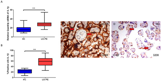 (A) IL-1β mRNA expression in women with LO-PE and HC. (B) IRS scores for IL-1β expression in the placental villi of the LO-PE and HC group. (C,D) Images showing immunostaining for IL-1β in the placental villi of the LO-PE and HC. p < 0.001 (***). Red arrow: IL-1β is highly expressed in the syncytiotrophoblast layer of the placentas of women affected by LO-PE in comparison to HC, in which the expression of this marker is slight and almost limited to some syncytiotrophoblasts and cytotrophoblasts.