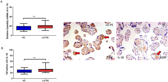 (A) Caspase 1 mRNA expression in women with LO-PE and HC. (B) IRS scores for caspase 1 expression in the placental villi of the LO-PE and HC group. (C,D) Images showing immunostaining for caspase 1 in the placental villi of the LO-PE and HC. p < 0.01 (**). Red arrows: IL-18 expression was strongly displayed throughout the placental villi of women affected by LO-PE in comparison to HC, in which a moderate expression of this cytokine can be observed in cytotrophoblast and other cells located in the inner of the placental villi.