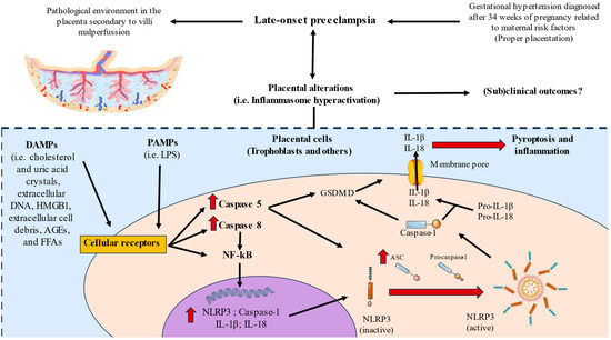 LO-PE is a type of obstetric complication associated with unique and differential alterations in the placenta. It is hypothesized that LO-PE is secondary to intraplacental (intervillous) malperfusion related to mechanical restrictions and an inability of the cardiovascular system to meet the increased metabolic demands of the fetoplacental unit [11,25]. Consequently, different responses in this tissue are conducted, including altered mitochondrial structure and function, oxidative stress, cell death, and inflammation [26]. In this study, we have found that LO-PE is associated with an exacerbated inflammasome activation in the placenta, evidenced by the increased gene and protein expression of NLRP3, ASC, caspase 1, caspase 5, caspase 8, IL-1β, and IL-18.