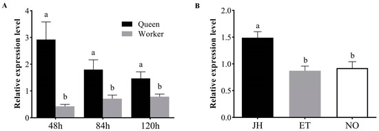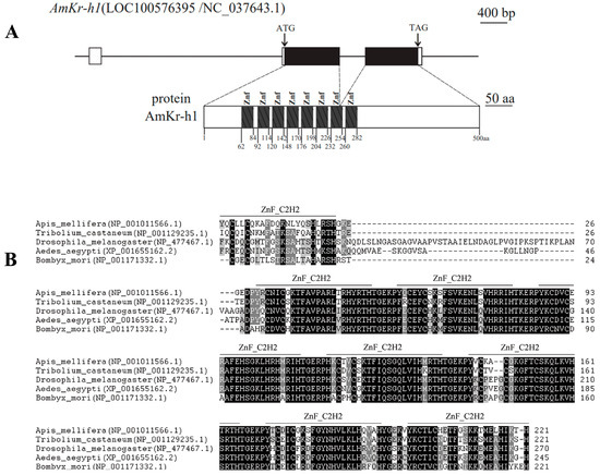 3.2. AmKr-h1 Has Higher Expression in Queen Larvae and Is Regulated by JH