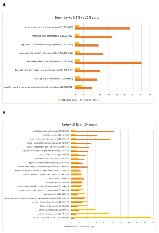 To further examine the functions of genes affected by 10 days of serum deprivation in our experiment we performed a gene ontology (GO) analysis. This corroborated that the downregulated genes were involved in the cell division cycle, for example, 22 genes were required for mitotic spindle organization (1.15E−03) and 13 genes were involved in the initiation of DNA replication (p = 4.04E−03) (Figure 6A; Supplementary Table S1).