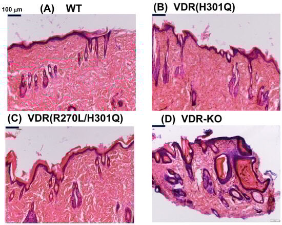 Skin samples were prepared from WT (15 weeks), Vdr(H301Q) (15 weeks), Vdr(R270L/H301Q) (15 weeks), and Vdr-KO (14 weeks) male rats, treated with 4% PFA (FUJIFILM Wako Pure Chemical Corporation, Osaka, Japan), and fixed at 4 °C for 15 h. The resultant samples were then filled with O.T.C compound (Sakura Finetek, Japan), frozen in liquid nitrogen, and then cut to a thickness of 20–25 μm using a cryostat microtome (Leica, Tokyo, Japan). The resulting cryosections were mounted on glass slides. The 4% PFA solution was dropped onto the sample glass, incubated at room temperature for 10 min, and then washed with water for 10 min. Hematoxylin was dropped onto the sample glass, incubated at room temperature for 15 min, and then washed with water for 10 min. Eosin–alcohol was dropped onto the sample glass, incubated for 2 min at room temperature, and washed with water for 2 min, 70% EtOH for 2 min, 80% EtOH for 2 min, 90% EtOH for 2 min, and 100% ethanol. An additional 2 min wash with EtOH was followed by two washes with xylene. The obtained HE-stained samples were observed using a phase contrast microscope (Olympus, Tokyo, Japan) (Figure 1).
