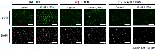 Primary keratinocytes were prepared from WT, Vdr(H301Q), or Vdr(R270L/H301Q) rats. The remarkable nuclear translocation of VDR was observed in WT and Vdr(H301Q) upon adding 10 nM of 1,25D3 (Figure 2). In contrast, no nuclear translocation was observed in Vdr (R270L/H301Q) under similar conditions. These results are consistent with our previous study [], which showed almost no affinity of VDR(R270L/H301Q) for 1,25D3.