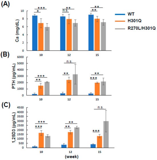 The plasma Ca level was decreased in the order of WT, Vdr(H301Q), and Vdr(R270L/H301Q) rats at 10, 12, and 15 weeks of age. The Ca levels in both GM rats were significantly reduced compared with the WT rats (Figure 3, Table 3). In contrast, the level of parathyroid hormone (PTH), whose secretion is induced by the reduced plasma Ca level via calcium-sensing receptor (CaSR) in the parathyroid, was significantly increased in both GM rats. Similarly, 1,25D3 levels in Vdr(H301Q) and Vdr(R270L/H301Q) rats were significantly higher than in WT rats (Figure 3 and Table 3). These results are quite consistent with the fact that PTH induces the expression of the Cyp27b1 gene [].