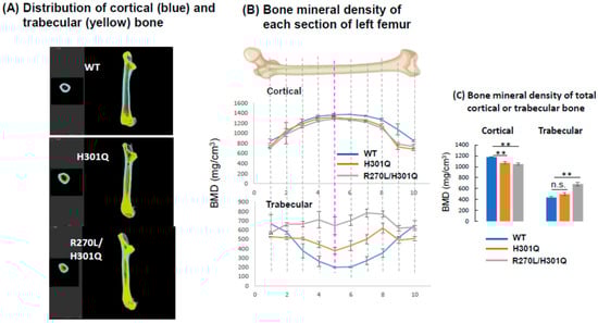 Three-dimensional deconvolution μ-CT images of femur vertical sections of WT, Vdr(H301Q), and Vdr(R270L/H301Q) rats at 15 weeks old. Cortical and trabecular bones are colored with cyan and yellow, respectively (A). BMD distribution between 10 horizonal sections of whole femurs of WT, Vdr(H301Q), and a Vdr(R270L/H301Q) rats. Sections 1 and 10 are the most proximal and distal sections, respectively (B). The bone mineral density (BMD) of the total cortical and trabecular bones are shown in (C). BMD values are the means ± SD (n = 4 for Vdr(H301Q) and Vdr(R270L/H301Q) rats, and n = 2 for WT rats). **: p < 0.01, and n.s.: not significant are determined by Student’s t-test.