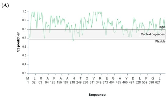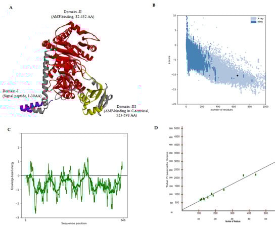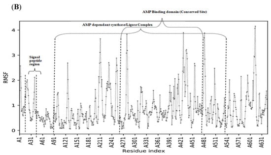 Out of three domains that were obtained during the secondary structure prediction (Figure 1A), the first domain was the signal peptide region, a short sequence of amino acids located at the N-terminus of a protein. It plays a crucial role in directing the protein to its correct cellular location. This region is recognised by the signal recognition particle (SRP), which helps in targeting the protein to the endoplasmic reticulum for further processing and secretion []. The AMP-dependent synthase/ligase domain (Domain II) appeared to function via an ATP-dependent covalent binding of AMP to its substrate. This domain is present in a number of prokaryotic and eukaryotic enzymes. The Ser/Thr/Gly-rich domain in this area is further distinguished by a conserved Pro-Lys-Gly triplet. This category of enzymes consists of acetyl-CoA synthetase, luciferase, long-chain fatty acid Co-A ligase, long-chain fatty acid transport proteins, and numerous other closely related synthetases. These enzymes play critical roles in various metabolic pathways and are essential for cellular function [,,]. The AMP-binding enzyme (Domain III) was found in the C-terminal region (Figure 1A), indicating its crucial role in the enzymatic activity of the protein. This domain is responsible for binding AMP molecules and facilitating their conversion into a different form or catalysing a reaction involving AMP. The presence of this domain suggests that the protein may play a role in energy metabolism or signalling pathways related to AMP [,,].