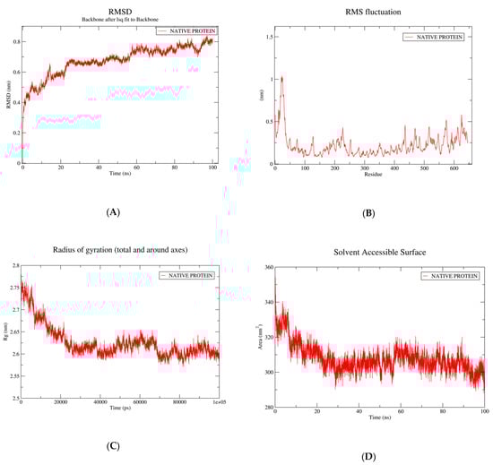To determine the residue level fluctuations concerning the most favourable conformation of the protein, a coarse dynamics study was performed using the CABS flex server (http://biocomp.chem.uw.edu.pI/CABSflex2/, accessed on 17 August 2022) as a simulation engine. CABS flex employs a coarse-grained protein model. The stability was determined from the root mean square fluctuation (RMSF) trajectories at the nanomolar (nm) scale, which were produced based on default constraints that gave pair atoms maximum and minimum ranges for undergoing their specific dynamic orientations within defined spaces. The fluctuations outside of the assigned ranges were penalised and labelled as unstable. In an aqueous environment generated by an all-atom molecular dynamics’ simulation (10 ns timescale with appropriate force fields), the default settings and constraints were optimised to combine coarse dynamics’ simulations and consensus protein fluctuations. The default mode was selected with minimum and maximum conformational distances of 3.8 and 8.0 Å, respectively; gap = 3 (minimum distance between the previous and next amino acid in the chain to be restrained).