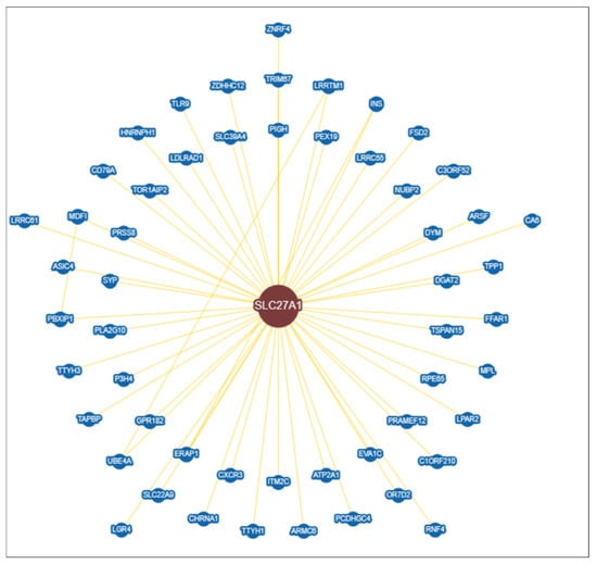 The top gene ontology biological process shown by the BioGRID version 4.4.226 includes (https://thebiogrid.org/132009/summary/homo-sapiens/slc27a1.html, accessed on 30 september 2023) the cardiolipin biosynthetic process, cellular lipid metabolic process, long-chain fatty acid transport, negative regulation of phospholipid biosynthetic process, phosphatidic acid biosynthetic process, phosphatidylcholine biosynthetic process, phosphatidylethanolamine biosynthetic process, phosphatidylglycerol biosynthetic process, phosphatidylinositol biosynthetic process, phosphatidylserine biosynthetic process, small molecule metabolic process, and transmembrane transport. The gene ontology cellular components involved the membrane and plasma membrane, which showed about 54 interactors (Supplementary Table S1) and 55 interactions which are mentioned in Supplementary Table S2. Out of these, 52 high throughput and 3 low throughput interactions were observed. The Biological General Repository for Interaction Dataset showed a network of Slc27a1 with various proteins, which can be visualised (Figure 5).