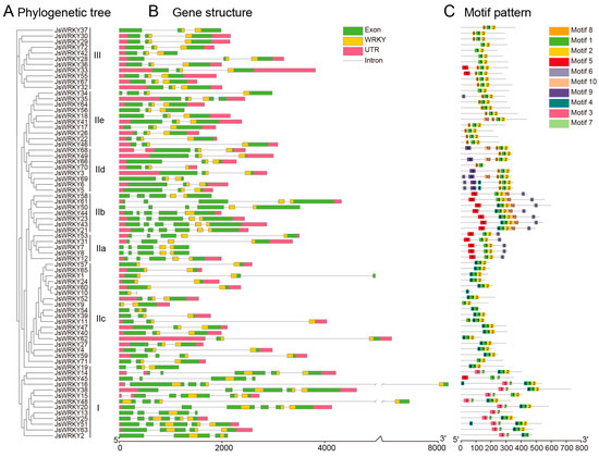 Phylogenetic tree, gene structure, and architecture of conserved protein motifs in WRKY genes from J. sambac. (A) The phylogenetic tree of WRKY protein sequences was constructed using IQ-TREE. (B) Gene structures of WRKY genes. The green box indicates the exon; gray line indicates the intron; and pink box indicates the 5′- and 3′-regions (UTR). The WRKY domain is highlighted with an orange box. (C) Distribution of conserved motifs in WRKY proteins. The motifs (named 1–10) are shown in different colored boxes.
