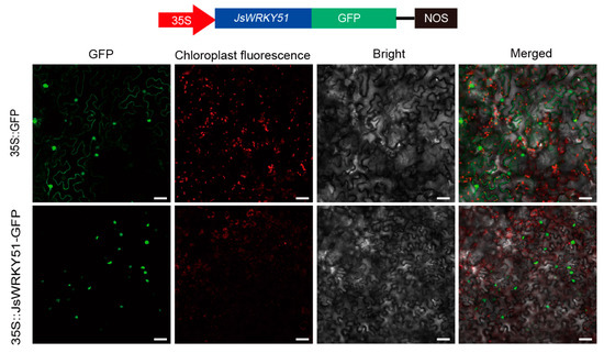 Given the potential function of JsWRKY51 in transcription regulation of JsTPSs, we constructed p35S::JsWRKY51-GFP and then used the tobacco leaf to examine their subcellular localization (Figure 6). The GFP fluorescence of both p35S::GFP and p35S::JsWRKY51-GFP was observed only in the nucleus, demonstrating that the JsWRKY51 transcription factor was localized in the nucleus.