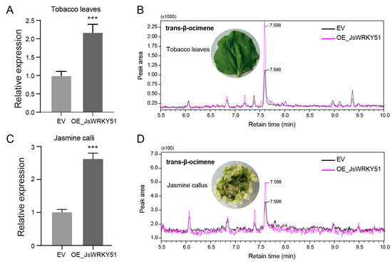 We constructed the recombinant plasmid carrying 35S::JsWRKY51 and performed transient overexpression in tobacco leaves. JsWRKY51 exhibited a significantly higher expression in the overexpression tobacco leaves (OE-JsWRKY51) than in empty vector-transformed (EV) leaves, indicating successful transformation (Figure 7A). Through GC-MS detection, the content of trans-β-ocimene in OE-JsWRKY51 tobacco leaves was increased by 34.78% compared to the EV (Figure 7A). Furthermore, we also successfully transiently transformed the 35S::JsWRKY51 plasmid into jasmine calli, which resulted in a significant accumulation of the trans-β-ocimene content (by approximately 25.78%) in jasmine OE-JsWRKY51 calli (Figure 7C,D). We also examined the expression level of JsTPS3 and observed a significant increase in expression in transgenic jasmine calli (Figure S3). These results suggest that JsWRKY51 plays a crucial role in β-ocimene biosynthesis, possibly by regulating the expression of JsTPS3.