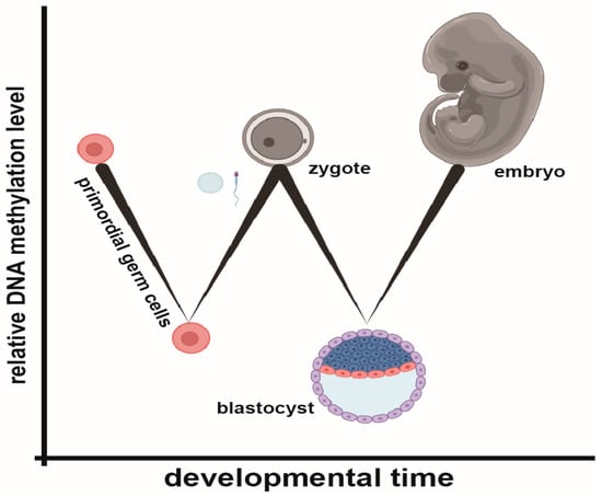 The epigenome functions to regulate DNA interactions and provides a basis for the storage and extraction of information across the genome. Radiating outward from a single cell, each of the trillions of derivative cells will adopt a unique epigenome, similar by cell and tissue type, responsive, and reinforced by an array of epigenetic regulators. Major epigenetic factors include covalent DNA modifications, such as DNA methylation (DNAme) or quadruplex structures, a multitude of histone modifications and chromatin remodelers, which facilitate DNA accessibility, as well as short- and long-noncoding RNAs that mediate DNA-protein interactions [1,2,3,4,5]. There are some cells which maintain epigenome plasticity over their lifetime (e.g., multipotent stem cells), while others exhibit terminal post-mitotic configurations (e.g., cardiomyocytes) [6,7,8,9,10,11,12]. Primordial germ cells (PGCs) and cells of the pre-implantation blastocyst stage of development will uniquely undergo a remarkable form of epigenetic remodeling, in which genome presentation is reset, and the genome evolves between parent and child [11,12,13,14,15]. During these stages, DNAme is globally removed. Yet, the decoration is again re-established during gametogenesis and blastocyst stages of development (Figure 1).