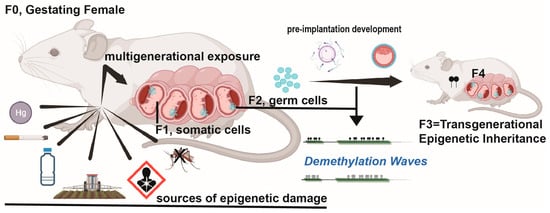 It is now widely understood that genotoxic or epimutation events in embryonic development can influence lifelong propensities to develop wide-ranging human pathophysiological conditions. This is especially true during embryonic development spanning PGC migration and development, where both first-generation (F1) embryos and second-generation (F2) PGCs may be exposed to the same toxin or its effects. Thus, when considering a gestating mother, only the detection of the epimutation that drives a phenotypic change in the F3 generation, without continued exposure to the original insult, can be considered transgenerational (Figure 4). If, however, exposure of the postnatal mother or father (F0) results in F1 germline exposure, then the first unexposed transgenerational effect is F2 [78]. In either case, continued transmission of the epigenetic effect suggests transgenerational maintenance.